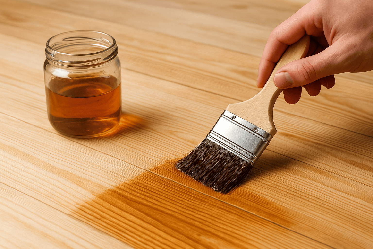 - Application de la première couche : appliquez l’huile au pinceau, spalter ou chiffon dans le sens des fibres. Laissez pénétrer 15 à 30 minutes, puis essuyez l’excédent.