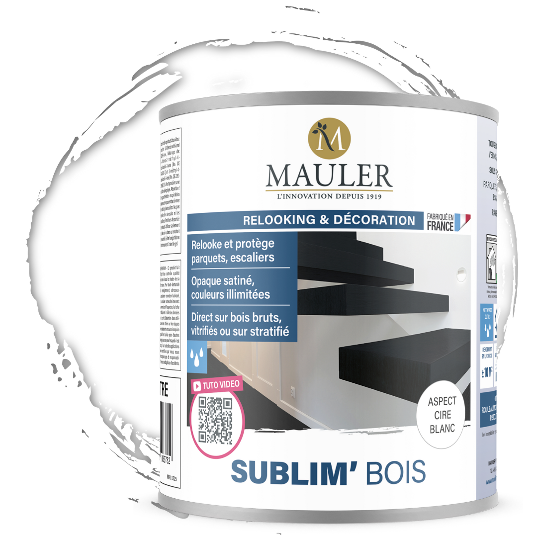Peinture bois intérieur Mauler SUBLIM’BOIS sans odeur : rénovation facile des parquets, escaliers et sols stratifiés, sans décapage ni sous-couche, finition cire.